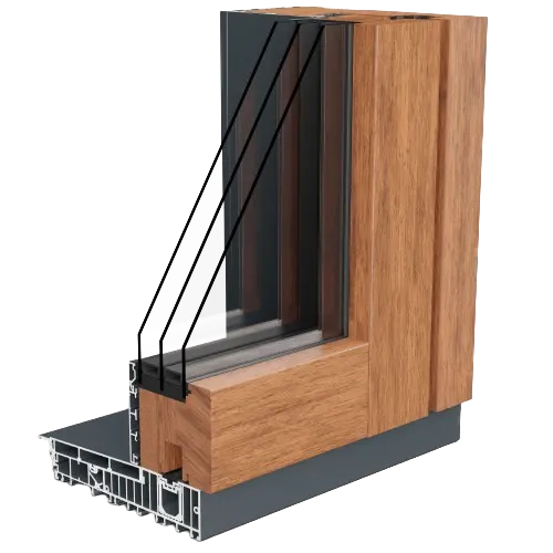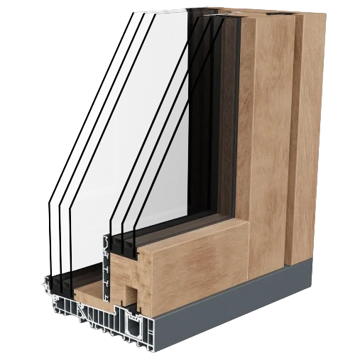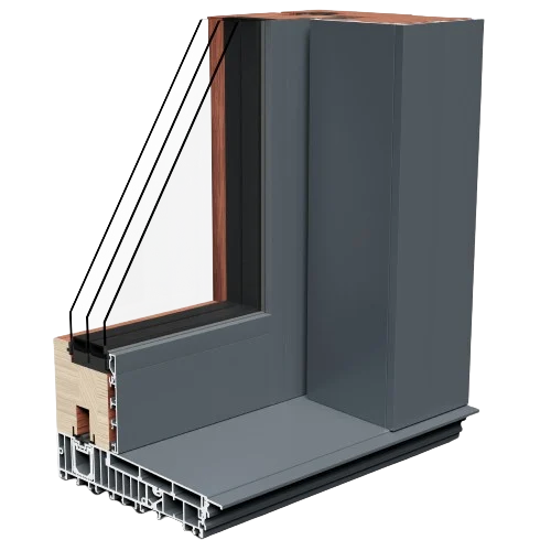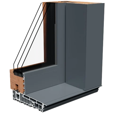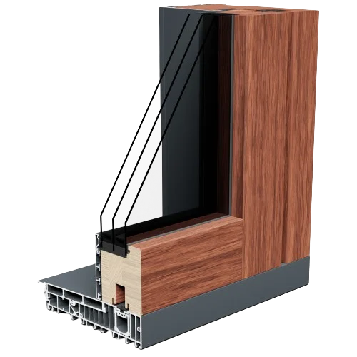Combinaison de bois à l’intérieur et d’aluminium à l’extérieur, disponible en profils de 78 et 90 mm. Solution idéale pour les grandes ouvertures et une connexion maximale avec l’extérieur.